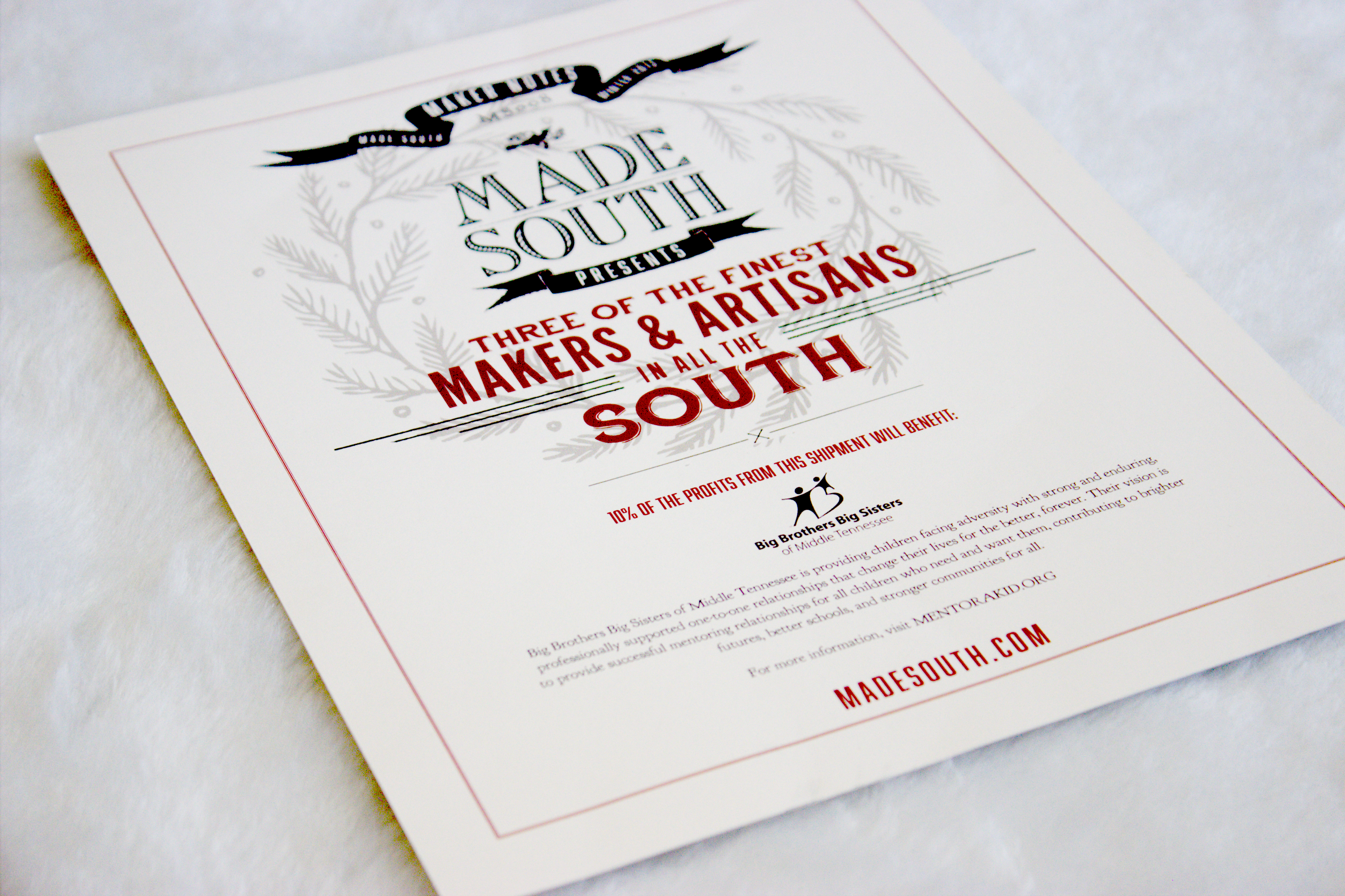 Not only are the products beautifully made and hand-crafted, 10% of the profits from each of these December boxes benefits Big Brothers Big Sisters of Middle Tennessee. Giving back to the community is something that is so important to me. I grew up giving back and firmly believe that if we take care of our community and our kids then we ensure our future.